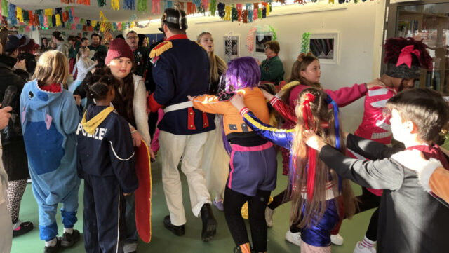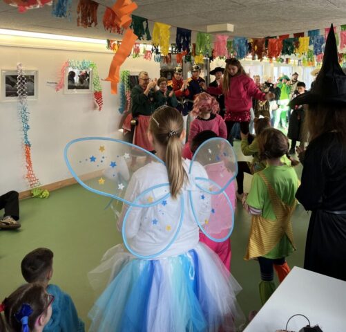 Närrischer Besuch kurz vor dem Schmutzige Dunschtig in unserer Schule: Mitglieder der Narrenzunft „Mimmenhausener Teufel“ waren bei uns zu Gast und verteilten an unsere Schülerinnen und Schüler teuflich gute Süßigkeiten und machten den Pausenhof zur Partymeile!
