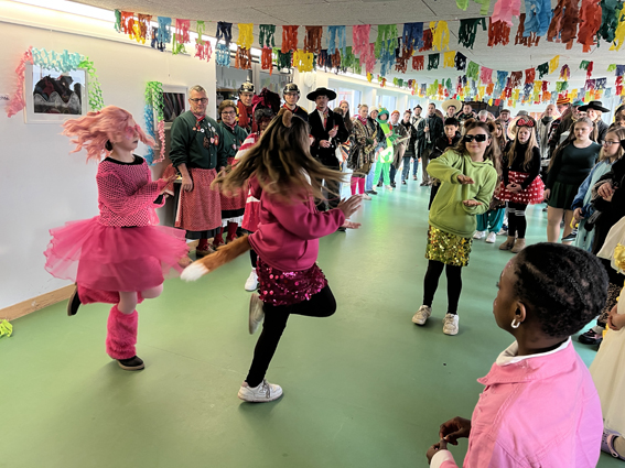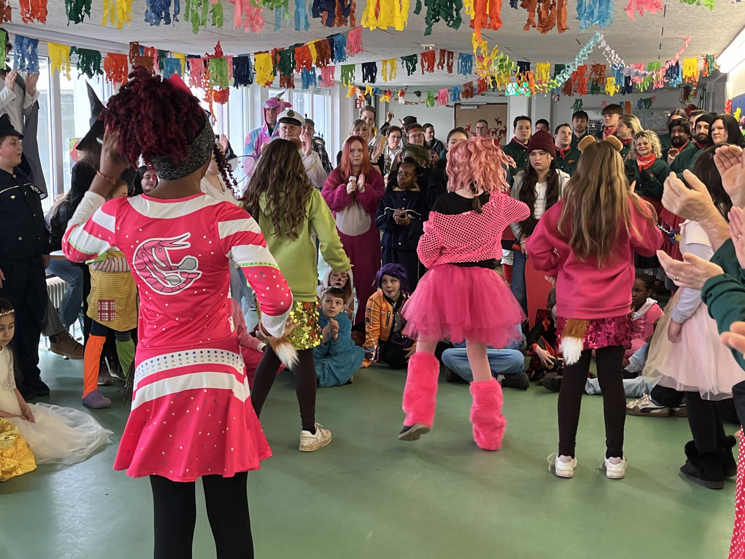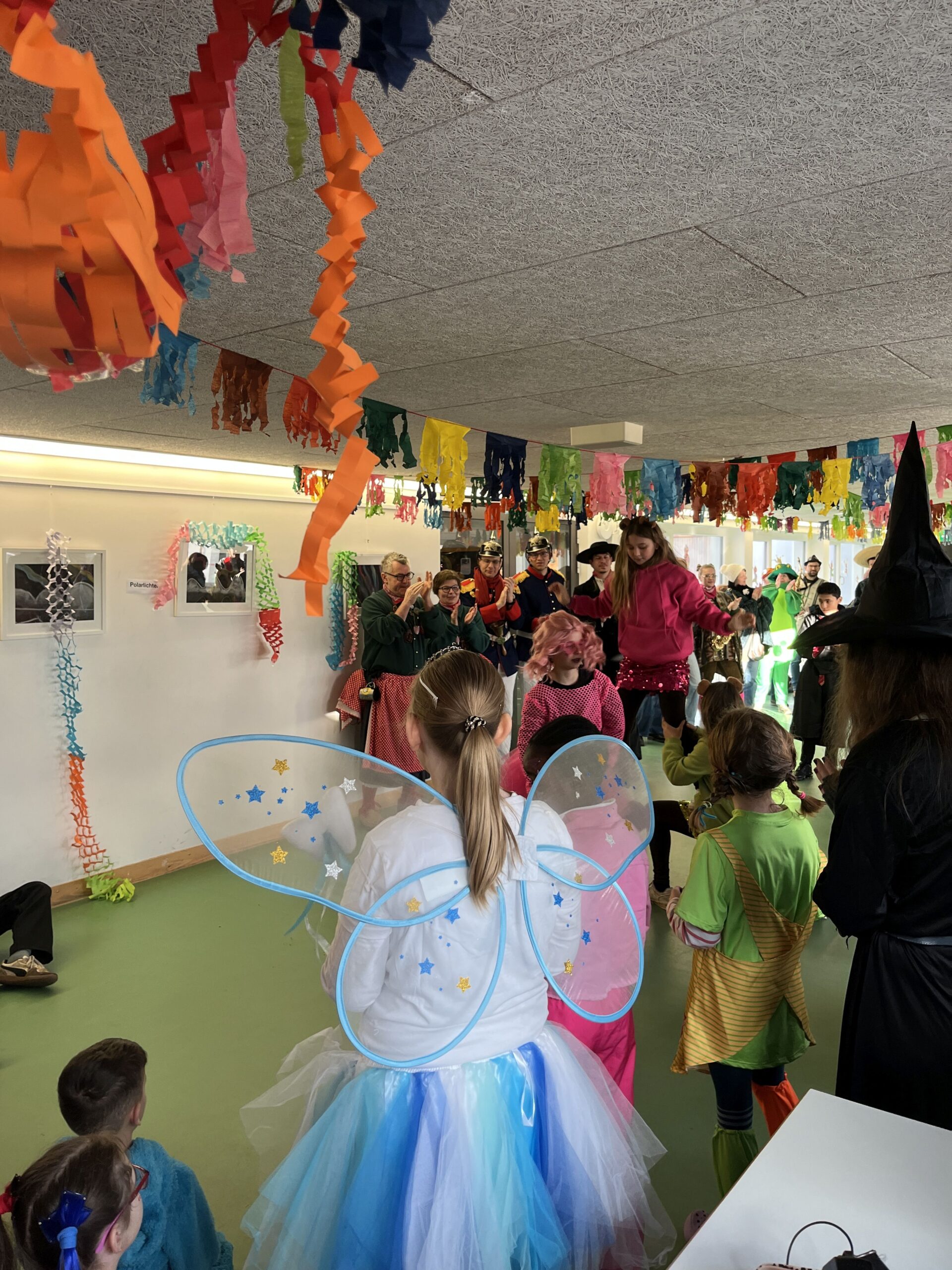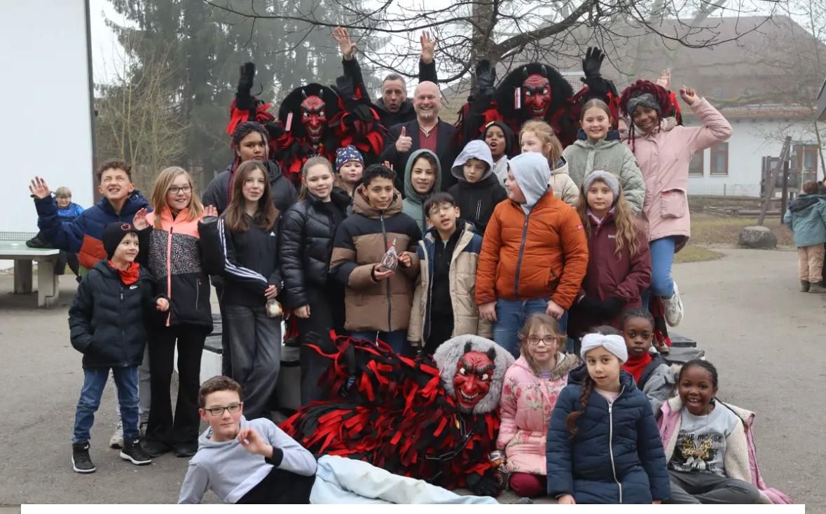 Närrischer Besuch kurz vor dem Schmutzige Dunschtig in unserer Schule: Mitglieder der Narrenzunft „Mimmenhausener Teufel“ waren bei uns zu Gast und verteilten an unsere Schülerinnen und Schüler teuflich gute Süßigkeiten und machten den Pausenhof zur Partymeile!